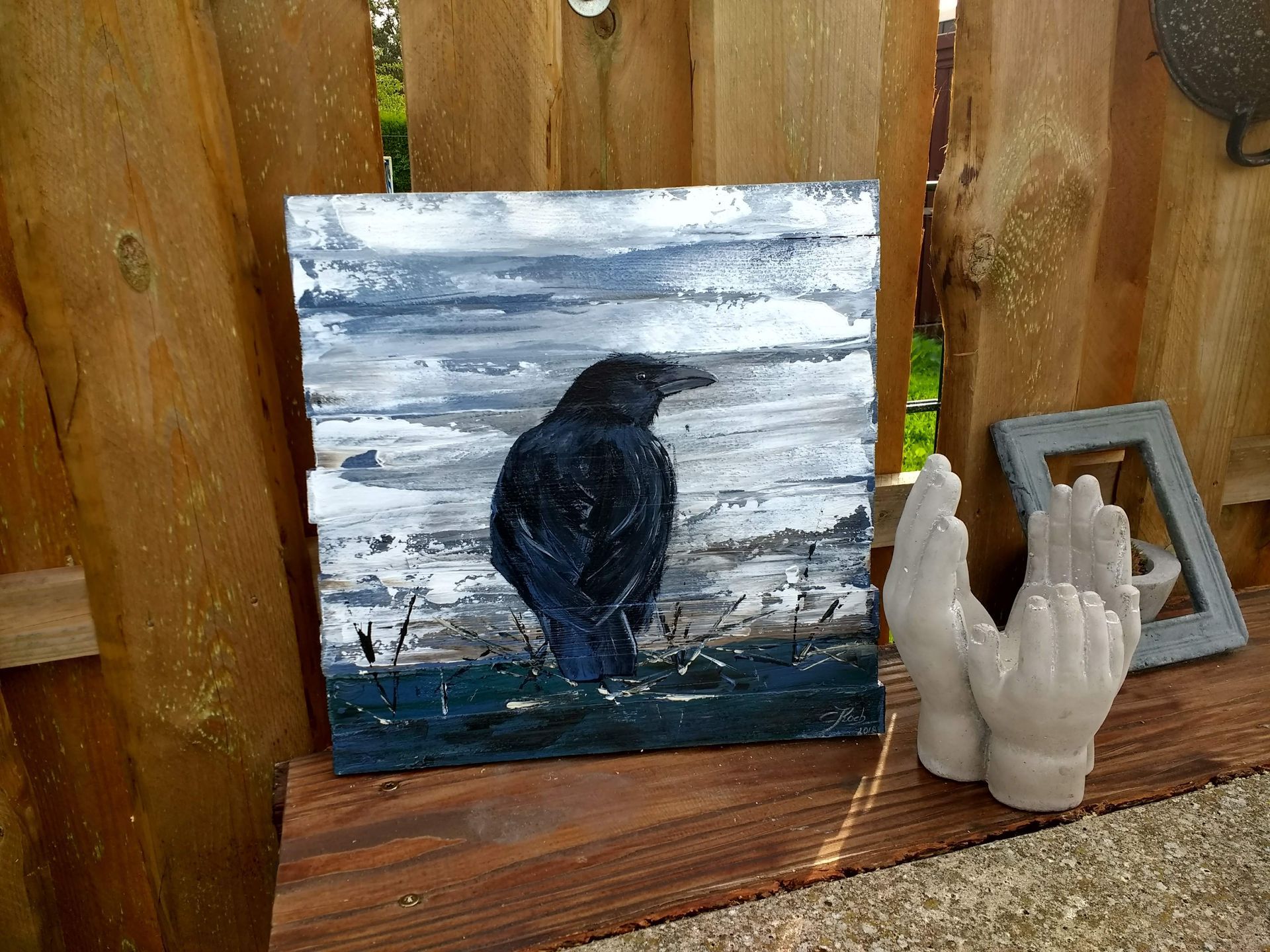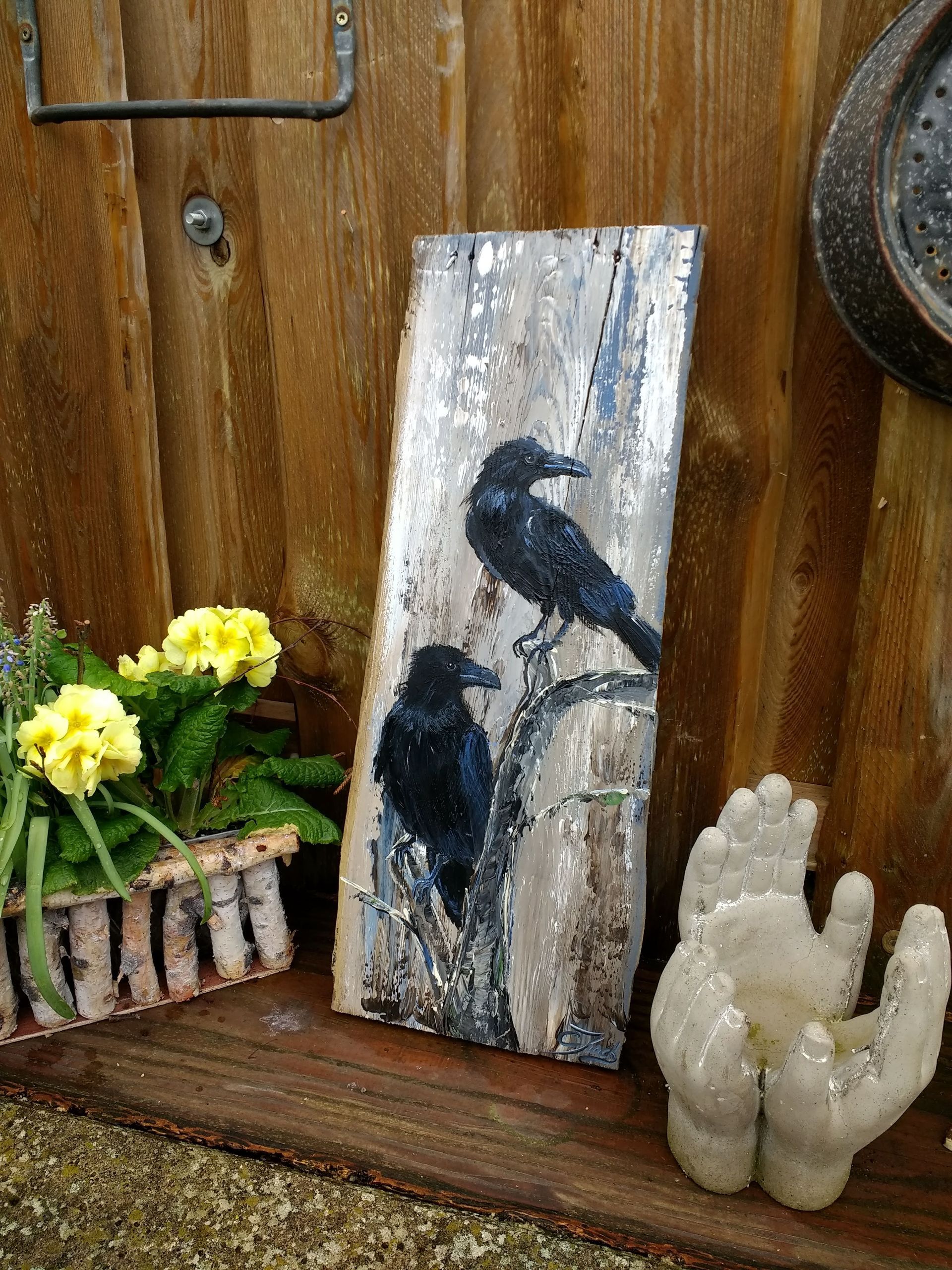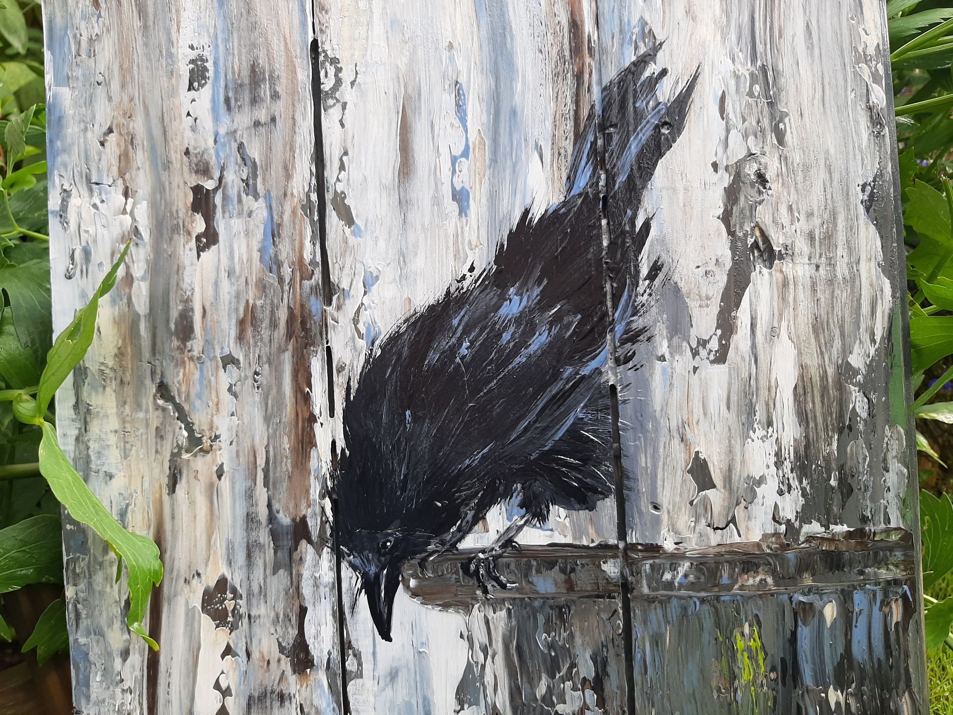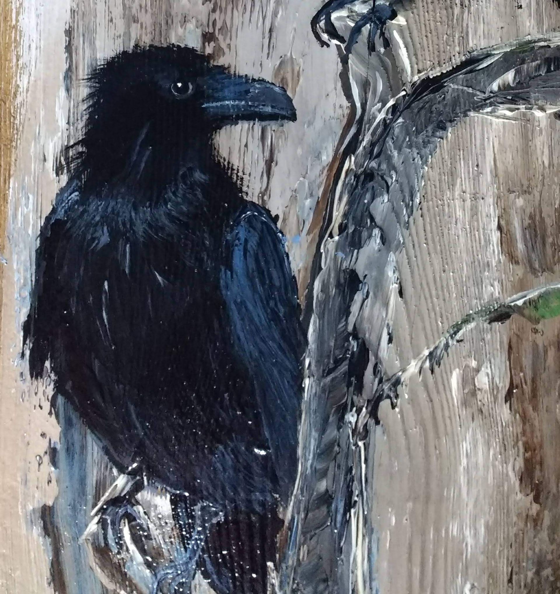 Ich male diese Vögel am liebsten auf Altholz, Treibholz oder alten Brettern. Ich mag raue Untergründe, und Holz ist dafür einfach perfekt. Die Risse und die Verwitterung passen einfach super zum tiefschwarzen Gefieder.