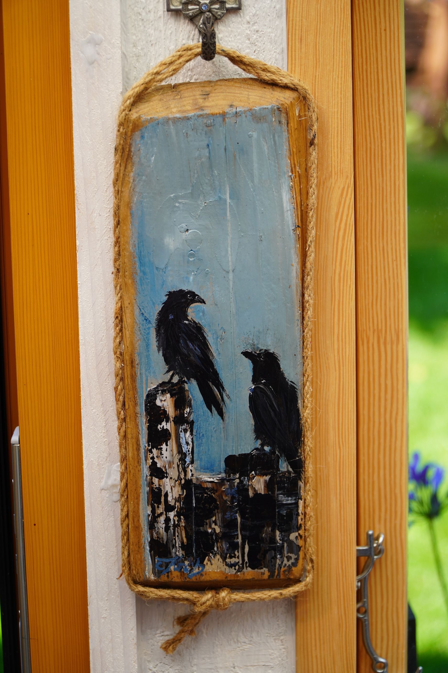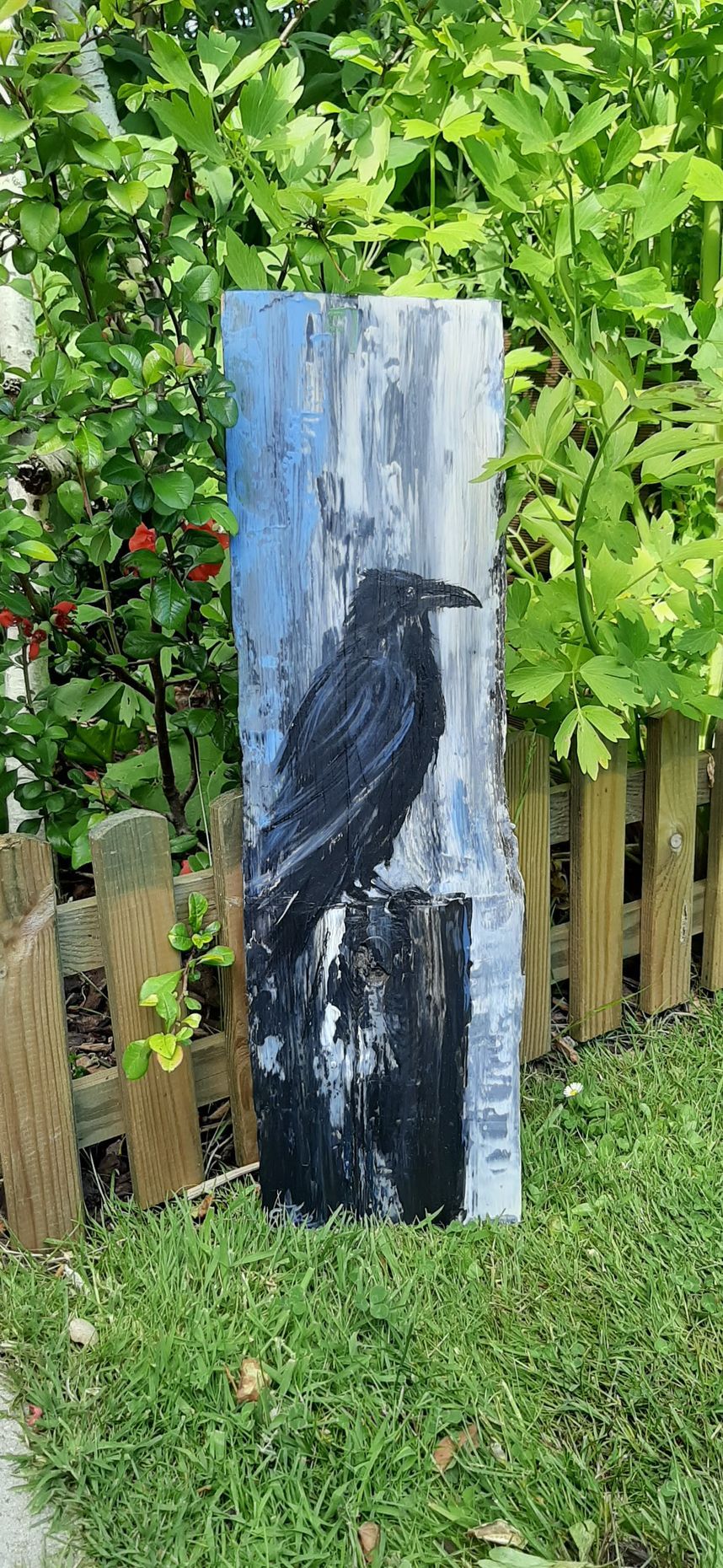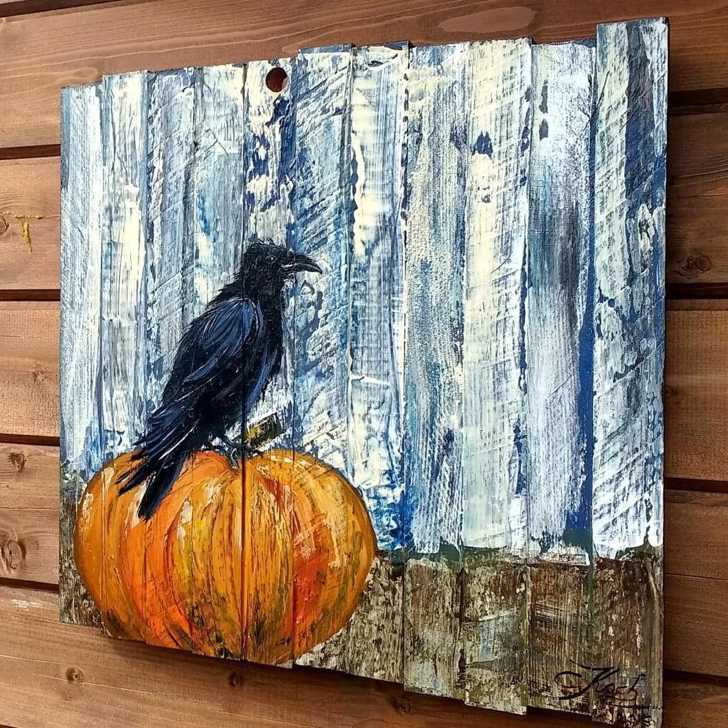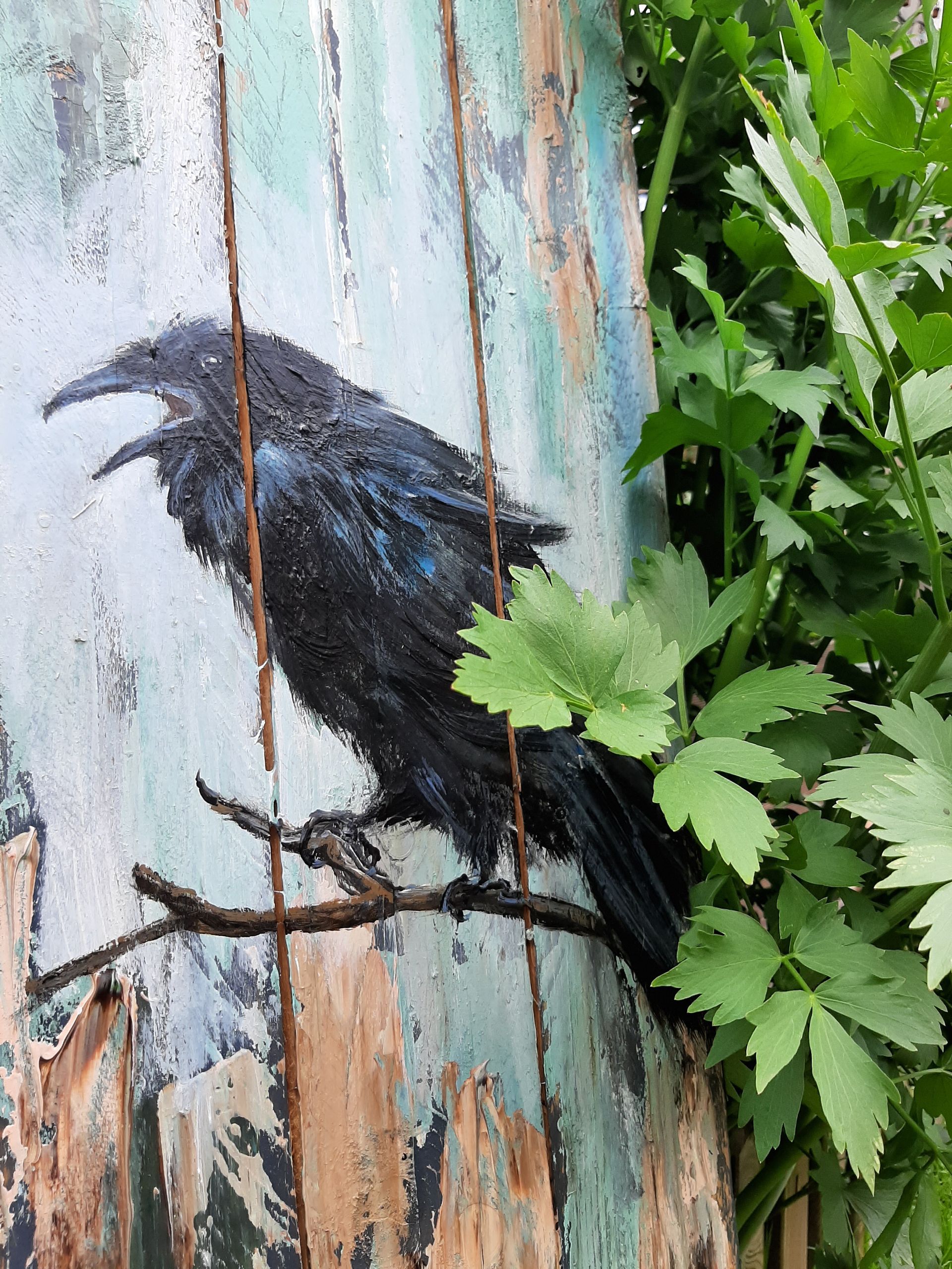 Ich male diese Vögel am liebsten auf Altholz, Treibholz oder alten Brettern. Ich mag raue Untergründe, und Holz ist dafür einfach perfekt. Die Risse und die Verwitterung passen einfach super zum tiefschwarzen Gefieder.